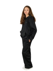 Костюм выполнен из плотного стрейчевого трикотажа без начеса без утеплителя. Костюм женский состоит из толстовки и брюк свободного кроя. Толстовка-анорак с капюшоном регулирующимся шнурком, с карманом кенгуру. Широкие брюки с двумя боковыми карманами на молнии. Костюм женский хороший вариант для повседневной носки , для прогулок. За изделием легко ухаживать. Сезон теплая весна/осень, прохладное лето.